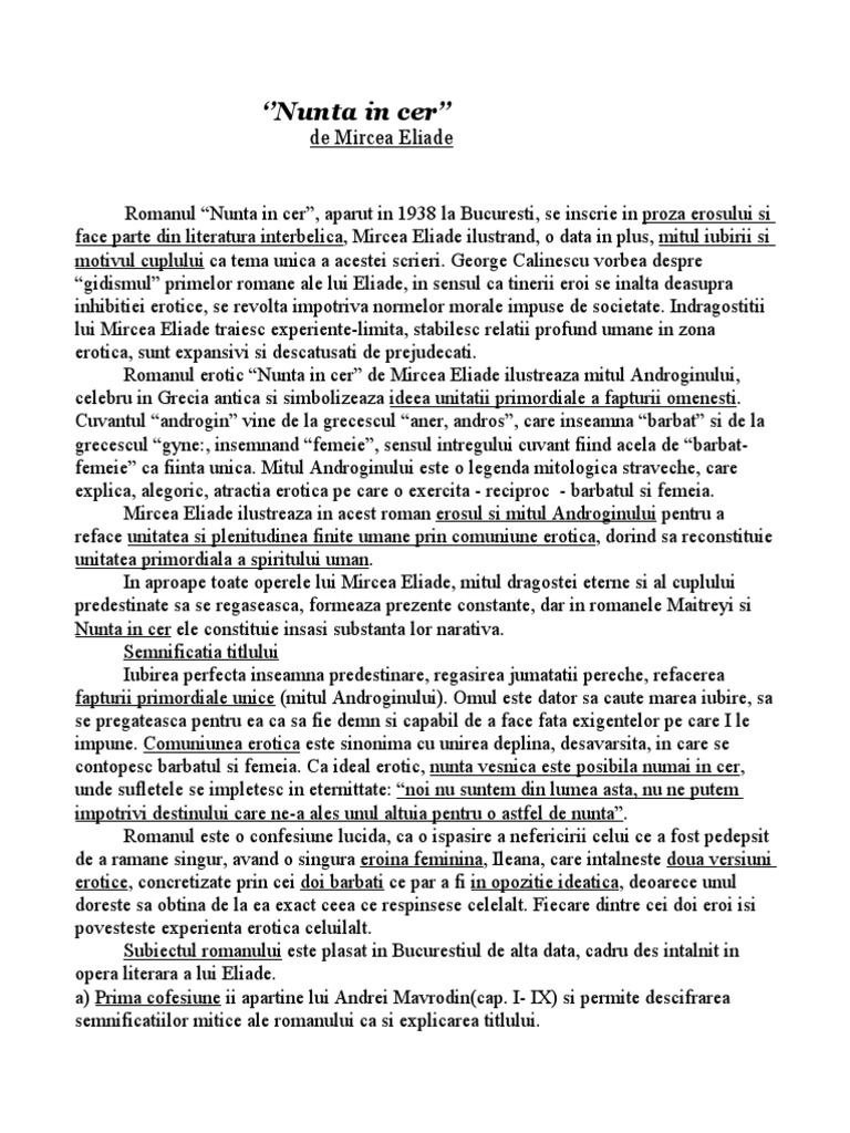 Doc Nunta In Cer Comentariu Literar Romanul Erotic De Mircea Eliade Bianca Sofronie Academia Edu