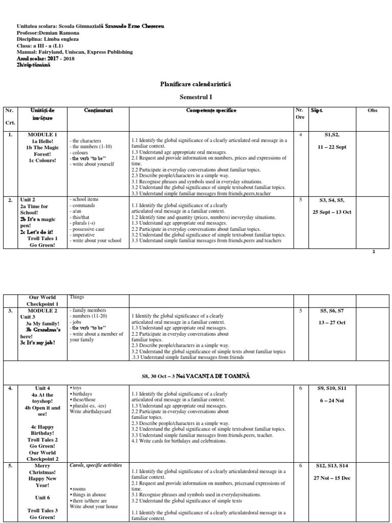 Planificare Calendaristica Incredible English Starter 2016 2017